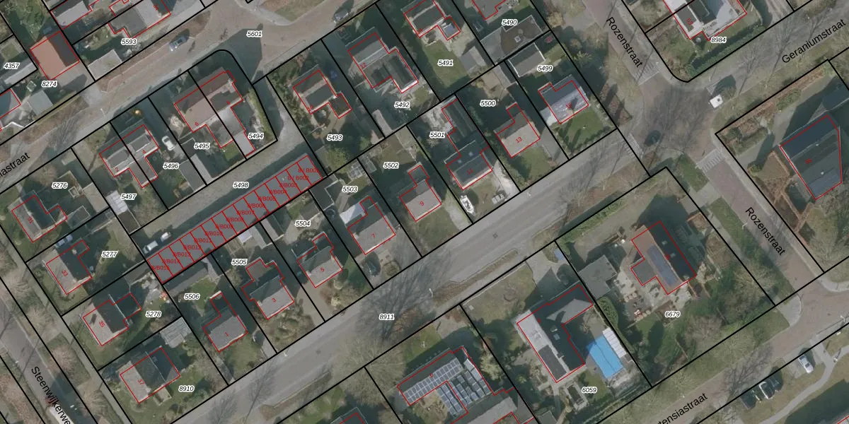 Geraniumstraat 9 is gelegen op kadastraal perceel WVG00D5502. Deze kadastrale aanduiding is uniek en wordt gebruikt door het Kadaster om eigendomsrechten en andere zakelijke rechten vast te leggen. Het perceel maakt onderdeel uit van de kadastrale gemeente Wolvega.