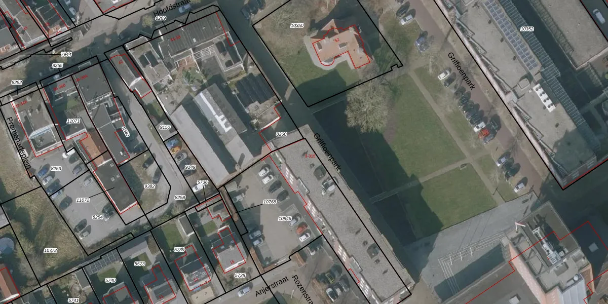 Het perceel waarop Griffioenpark 7 staat heeft een oppervlakte van 1497 m². Dit is een zeer groot perceel. De perceeloppervlakte wordt geregistreerd door het Kadaster. Gedetailleerde informatie over de maten van dit perceel kunt u vinden in het rapport Kadastrale kaart met maatvoering van Griffioenpark 7.