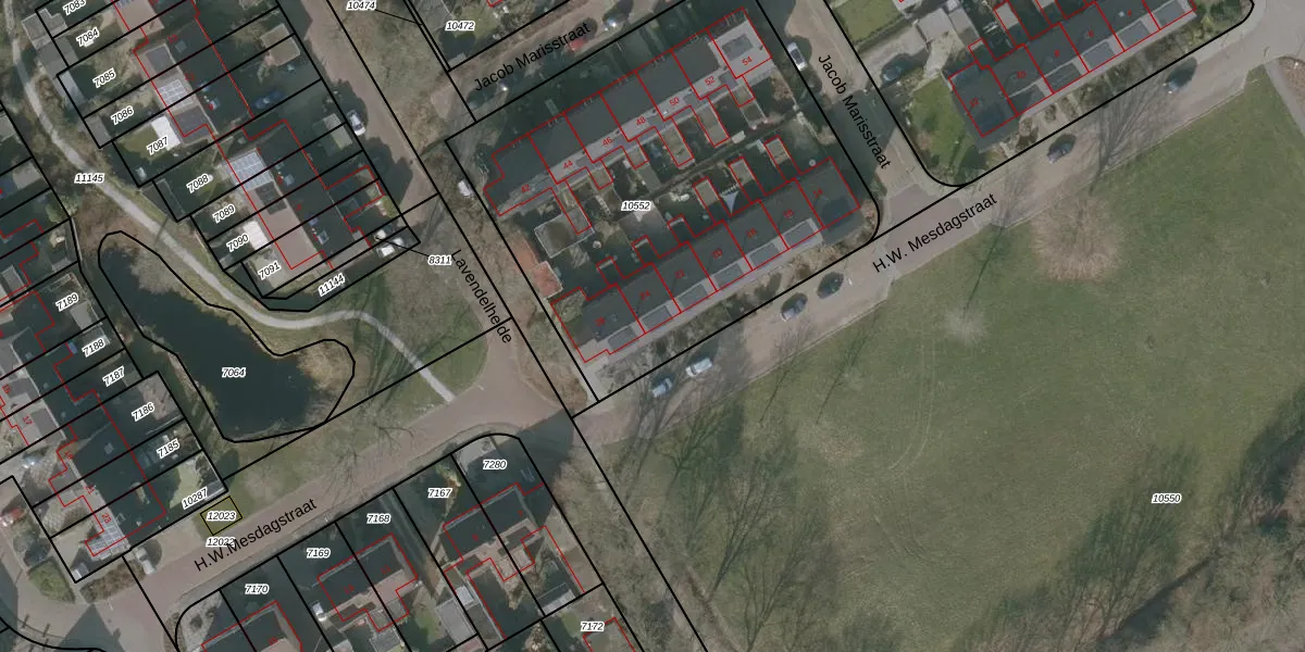 Het perceel waarop H.W.Mesdagstraat 24 staat heeft een oppervlakte van 2390 m². Dit is een zeer groot perceel. De perceeloppervlakte wordt geregistreerd door het Kadaster. Gedetailleerde informatie over de maten van dit perceel kunt u vinden in het rapport Kadastrale kaart met maatvoering van H.W.Mesdagstraat 24.