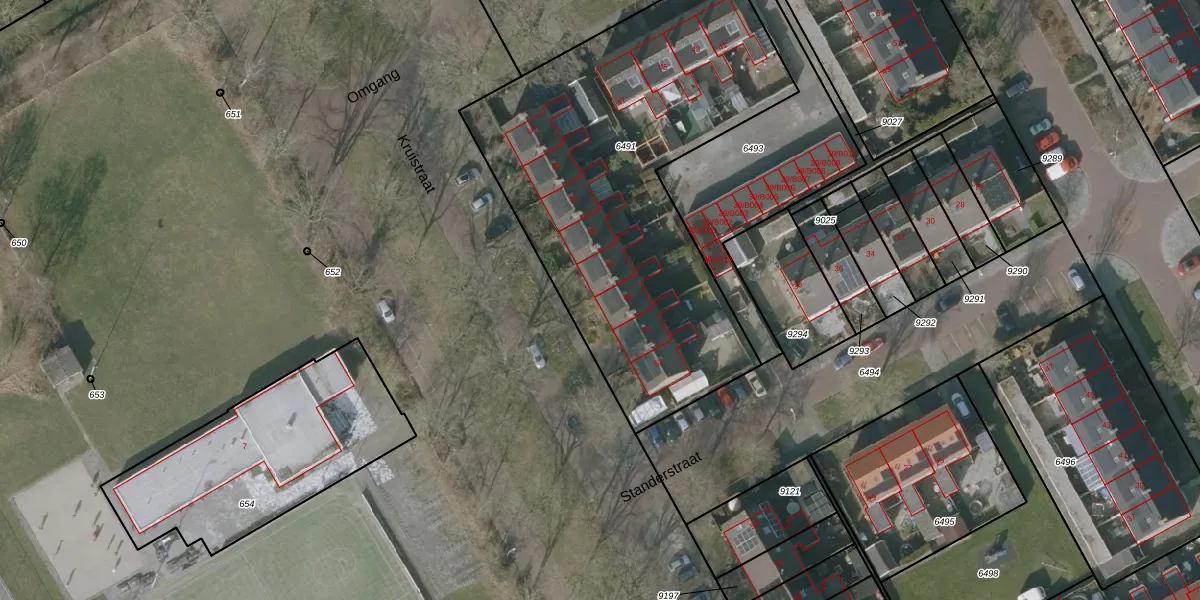 Het perceel waarop Kruistraat 56 staat heeft een oppervlakte van 2139 m². Dit is een zeer groot perceel. De perceeloppervlakte wordt geregistreerd door het Kadaster. Gedetailleerde informatie over de maten van dit perceel kunt u vinden in het rapport Kadastrale kaart met maatvoering van Kruistraat 56.