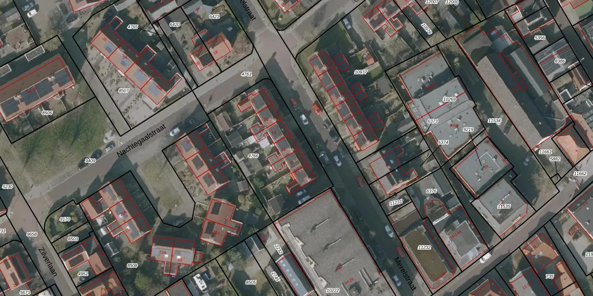 Het perceel waarop Merelstraat 11 staat heeft een oppervlakte van 1045 m². Dit is een zeer groot perceel. De perceeloppervlakte wordt geregistreerd door het Kadaster. Gedetailleerde informatie over de maten van dit perceel kunt u vinden in het rapport Kadastrale kaart met maatvoering van Merelstraat 11.
