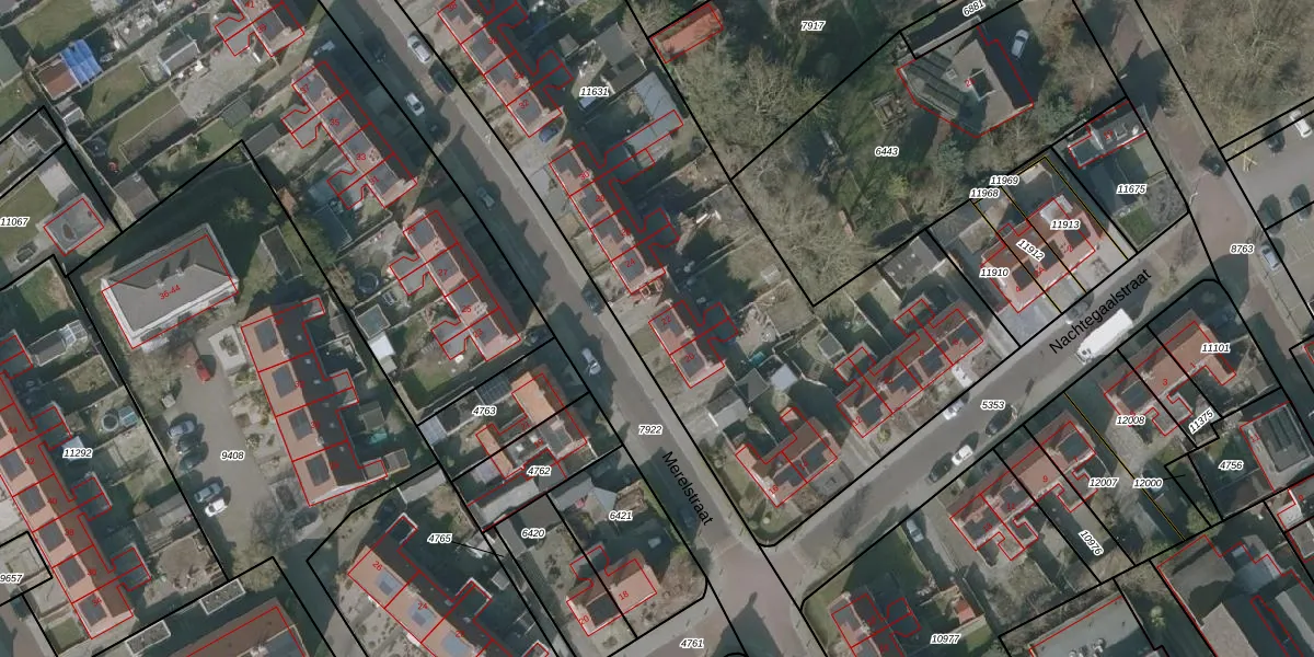 Het perceel waarop Merelstraat 22 staat heeft een oppervlakte van 4842 m². Dit is een zeer groot perceel. De perceeloppervlakte wordt geregistreerd door het Kadaster. Gedetailleerde informatie over de maten van dit perceel kunt u vinden in het rapport Kadastrale kaart met maatvoering van Merelstraat 22.