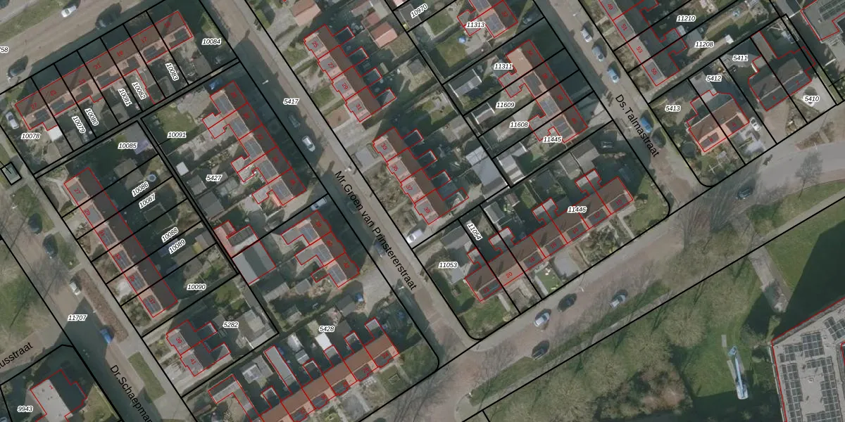Het perceel waarop Mr.Groen van Prinstererstraat 39 staat heeft een oppervlakte van 2853 m². Dit is een zeer groot perceel. De perceeloppervlakte wordt geregistreerd door het Kadaster. Gedetailleerde informatie over de maten van dit perceel kunt u vinden in het rapport Kadastrale kaart met maatvoering van Mr.Groen van Prinstererstraat 39.