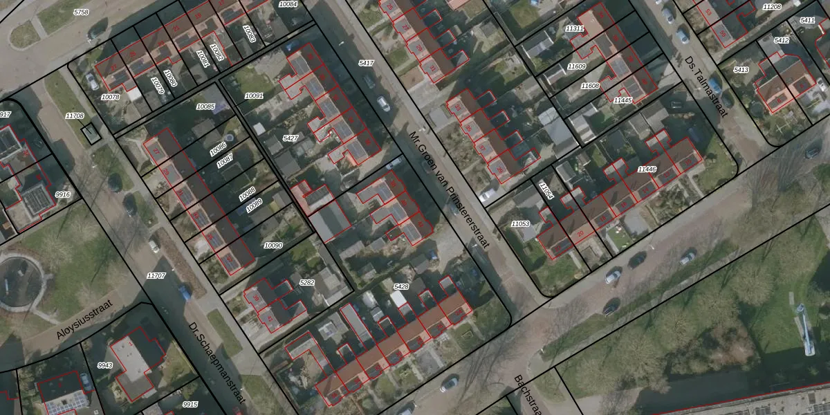 Het perceel waarop Mr.Groen van Prinstererstraat 40 staat heeft een oppervlakte van 2165 m². Dit is een zeer groot perceel. De perceeloppervlakte wordt geregistreerd door het Kadaster. Gedetailleerde informatie over de maten van dit perceel kunt u vinden in het rapport Kadastrale kaart met maatvoering van Mr.Groen van Prinstererstraat 40.