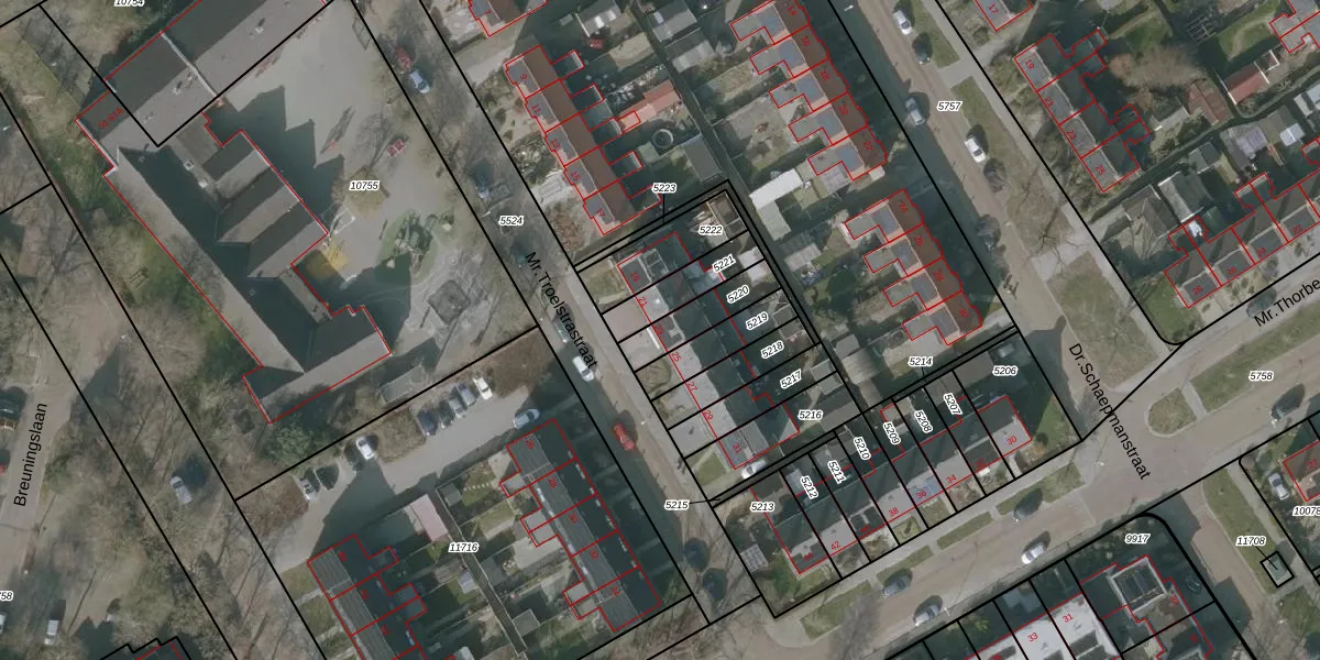Gebruik de zoekbalk of klik op een perceel voor informatie over de adressen binnen dit perceel.
