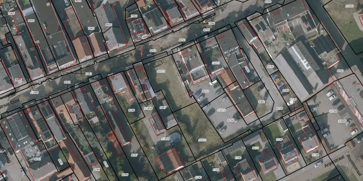 Het perceel waarop Promenadeplein 14 staat heeft een oppervlakte van 463 m². Dit is een groot perceel. De perceeloppervlakte wordt geregistreerd door het Kadaster. Gedetailleerde informatie over de maten van dit perceel kunt u vinden in het rapport Kadastrale kaart met maatvoering van Promenadeplein 14.
