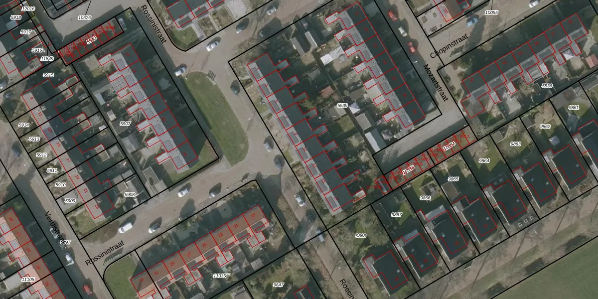 Het perceel waarop Rossinistraat 11 staat heeft een oppervlakte van 3056 m². Dit is een zeer groot perceel. De perceeloppervlakte wordt geregistreerd door het Kadaster. Gedetailleerde informatie over de maten van dit perceel kunt u vinden in het rapport Kadastrale kaart met maatvoering van Rossinistraat 11.
