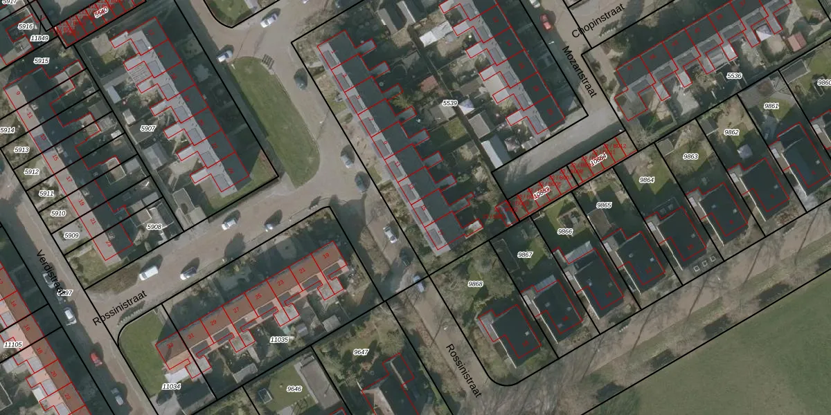 Het perceel waarop Rossinistraat 15 staat heeft een oppervlakte van 3056 m². Dit is een zeer groot perceel. De perceeloppervlakte wordt geregistreerd door het Kadaster. Gedetailleerde informatie over de maten van dit perceel kunt u vinden in het rapport Kadastrale kaart met maatvoering van Rossinistraat 15.