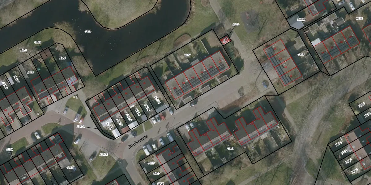 Het perceel waarop Struikheide 58 staat heeft een oppervlakte van 1079 m². Dit is een zeer groot perceel. De perceeloppervlakte wordt geregistreerd door het Kadaster. Gedetailleerde informatie over de maten van dit perceel kunt u vinden in het rapport Kadastrale kaart met maatvoering van Struikheide 58.