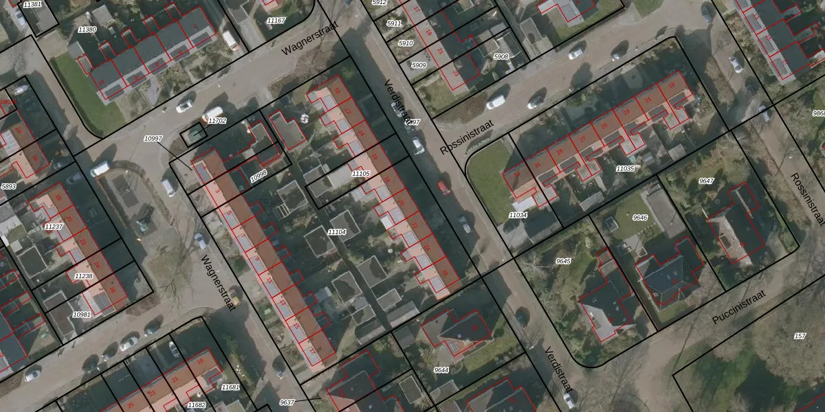 Het perceel waarop Verdistraat 20 staat heeft een oppervlakte van 2645 m². Dit is een zeer groot perceel. De perceeloppervlakte wordt geregistreerd door het Kadaster. Gedetailleerde informatie over de maten van dit perceel kunt u vinden in het rapport Kadastrale kaart met maatvoering van Verdistraat 20.
