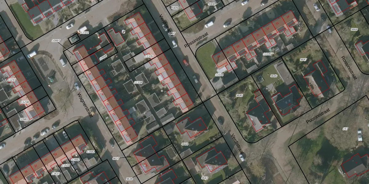 Het perceel waarop Verdistraat 24 staat heeft een oppervlakte van 2645 m². Dit is een zeer groot perceel. De perceeloppervlakte wordt geregistreerd door het Kadaster. Gedetailleerde informatie over de maten van dit perceel kunt u vinden in het rapport Kadastrale kaart met maatvoering van Verdistraat 24.