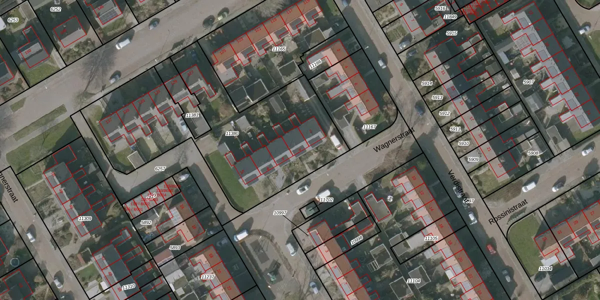 Het perceel waarop Wagnerstraat 4 staat heeft een oppervlakte van 2315 m². Dit is een zeer groot perceel. De perceeloppervlakte wordt geregistreerd door het Kadaster. Gedetailleerde informatie over de maten van dit perceel kunt u vinden in het rapport Kadastrale kaart met maatvoering van Wagnerstraat 4.