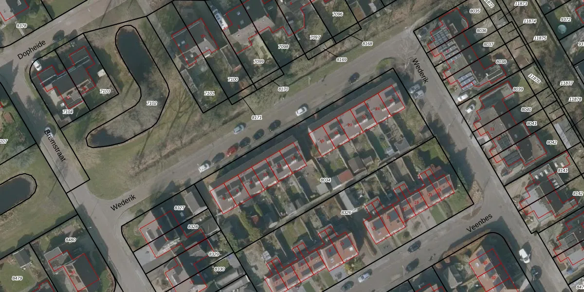 Het perceel waarop Wederik 14 staat heeft een oppervlakte van 2173 m². Dit is een zeer groot perceel. De perceeloppervlakte wordt geregistreerd door het Kadaster. Gedetailleerde informatie over de maten van dit perceel kunt u vinden in het rapport Kadastrale kaart met maatvoering van Wederik 14.