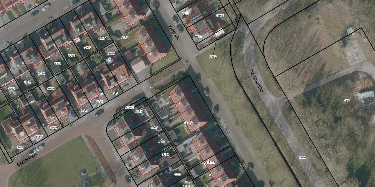 Het perceel waarop Wederik 42 staat heeft een oppervlakte van 1165 m². Dit is een zeer groot perceel. De perceeloppervlakte wordt geregistreerd door het Kadaster. Gedetailleerde informatie over de maten van dit perceel kunt u vinden in het rapport Kadastrale kaart met maatvoering van Wederik 42.
