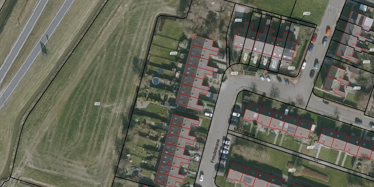 Freuleleane 24 is gelegen op kadastraal perceel WMS02F1606. Deze kadastrale aanduiding is uniek en wordt gebruikt door het Kadaster om eigendomsrechten en andere zakelijke rechten vast te leggen. Het perceel maakt onderdeel uit van de kadastrale gemeente Wommels.