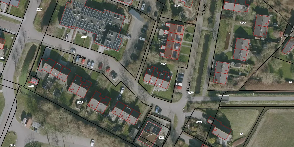 Het perceel waarop 't Bosk 73 staat heeft een oppervlakte van 1350 m². Dit is een zeer groot perceel. De perceeloppervlakte wordt geregistreerd door het Kadaster. Gedetailleerde informatie over de maten van dit perceel kunt u vinden in het rapport Kadastrale kaart met maatvoering van 't Bosk 73.