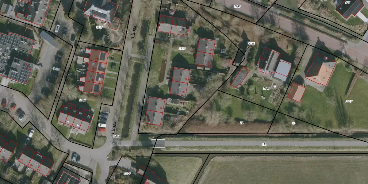 Het perceel waarop 't Bosk 90 staat heeft een oppervlakte van 2465 m². Dit is een zeer groot perceel. De perceeloppervlakte wordt geregistreerd door het Kadaster. Gedetailleerde informatie over de maten van dit perceel kunt u vinden in het rapport Kadastrale kaart met maatvoering van 't Bosk 90.