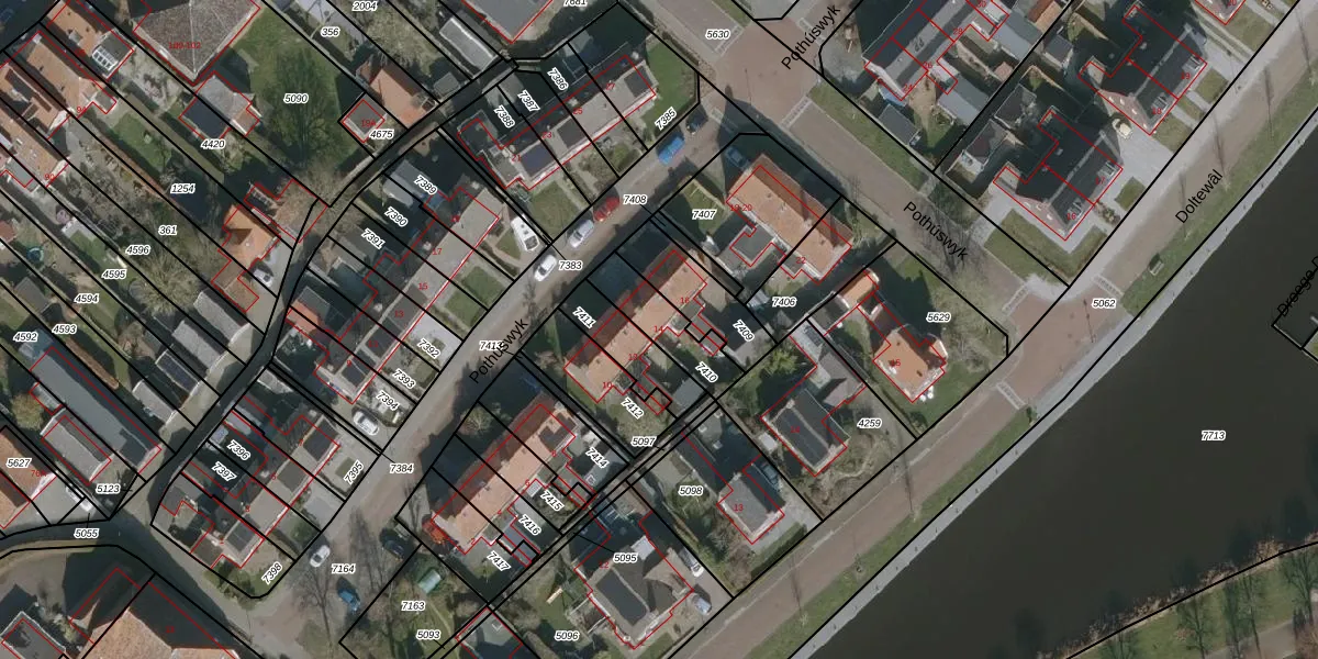 Het perceel waarop Pothúswyk 14 staat heeft een oppervlakte van 166 m². Dit is een middelgroot perceel. De perceeloppervlakte wordt geregistreerd door het Kadaster. Gedetailleerde informatie over de maten van dit perceel kunt u vinden in het rapport Kadastrale kaart met maatvoering van Pothúswyk 14.
