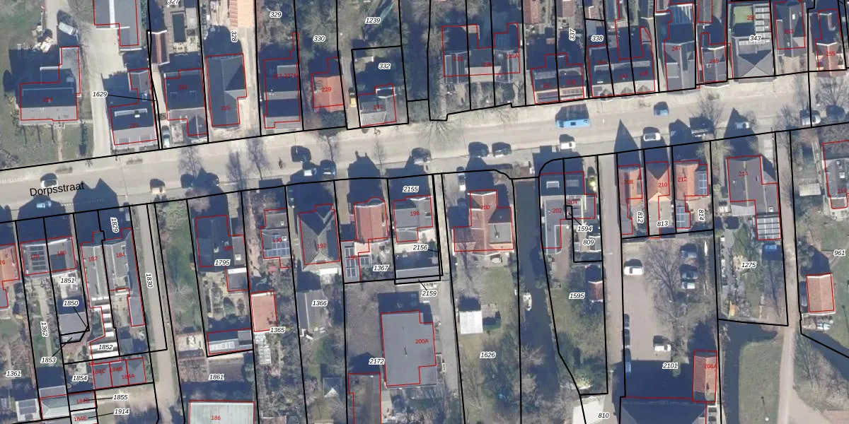 Het perceel waarop Dorpsstraat 198 staat heeft een oppervlakte van 262 m². Dit is een middelgroot perceel. De perceeloppervlakte wordt geregistreerd door het Kadaster. Gedetailleerde informatie over de maten van dit perceel kunt u vinden in het rapport Kadastrale kaart met maatvoering van Dorpsstraat 198.