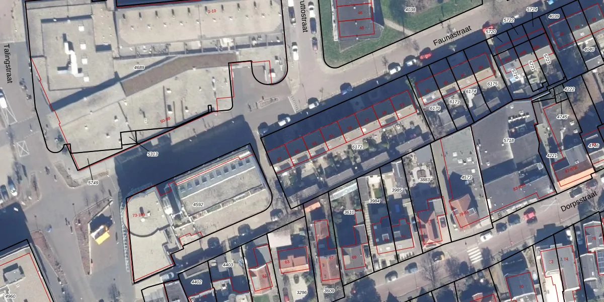 Het perceel waarop Faunastraat 65 staat heeft een oppervlakte van 1304 m². Dit is een zeer groot perceel. De perceeloppervlakte wordt geregistreerd door het Kadaster. Gedetailleerde informatie over de maten van dit perceel kunt u vinden in het rapport Kadastrale kaart met maatvoering van Faunastraat 65.