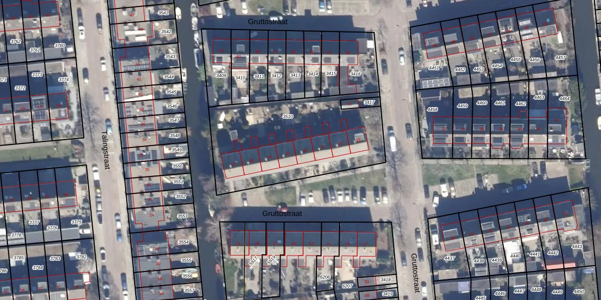 Het perceel waarop Gruttostraat 39 staat heeft een oppervlakte van 1467 m². Dit is een zeer groot perceel. De perceeloppervlakte wordt geregistreerd door het Kadaster. Gedetailleerde informatie over de maten van dit perceel kunt u vinden in het rapport Kadastrale kaart met maatvoering van Gruttostraat 39.