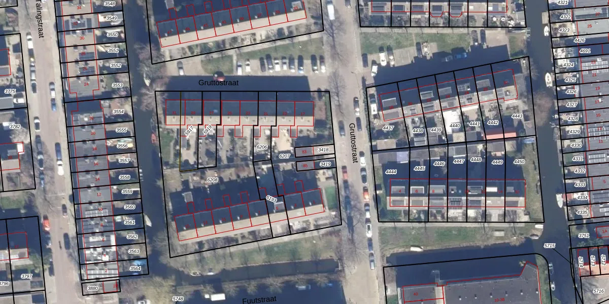 Het perceel waarop Gruttostraat 83 staat heeft een oppervlakte van 41 m². Dit is een klein perceel. De perceeloppervlakte wordt geregistreerd door het Kadaster. Gedetailleerde informatie over de maten van dit perceel kunt u vinden in het rapport Kadastrale kaart met maatvoering van Gruttostraat 83.