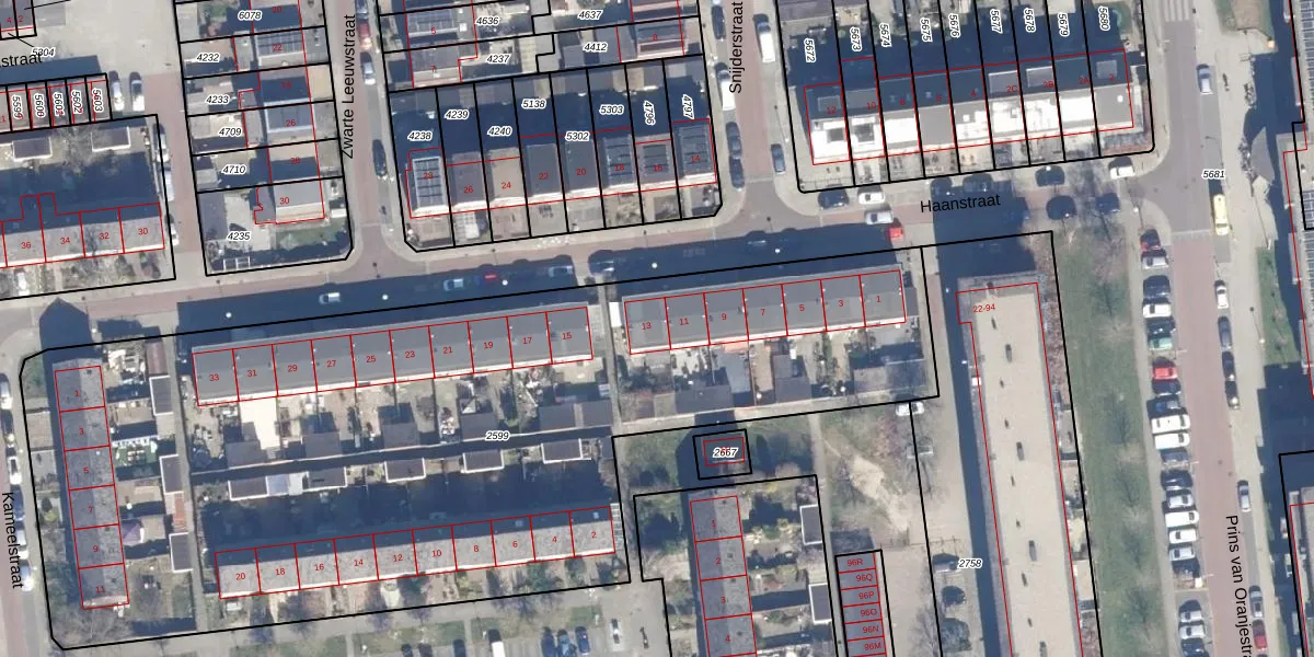 Het perceel waarop Haanstraat 13 staat heeft een oppervlakte van 5183 m². Dit is een zeer groot perceel. De perceeloppervlakte wordt geregistreerd door het Kadaster. Gedetailleerde informatie over de maten van dit perceel kunt u vinden in het rapport Kadastrale kaart met maatvoering van Haanstraat 13.