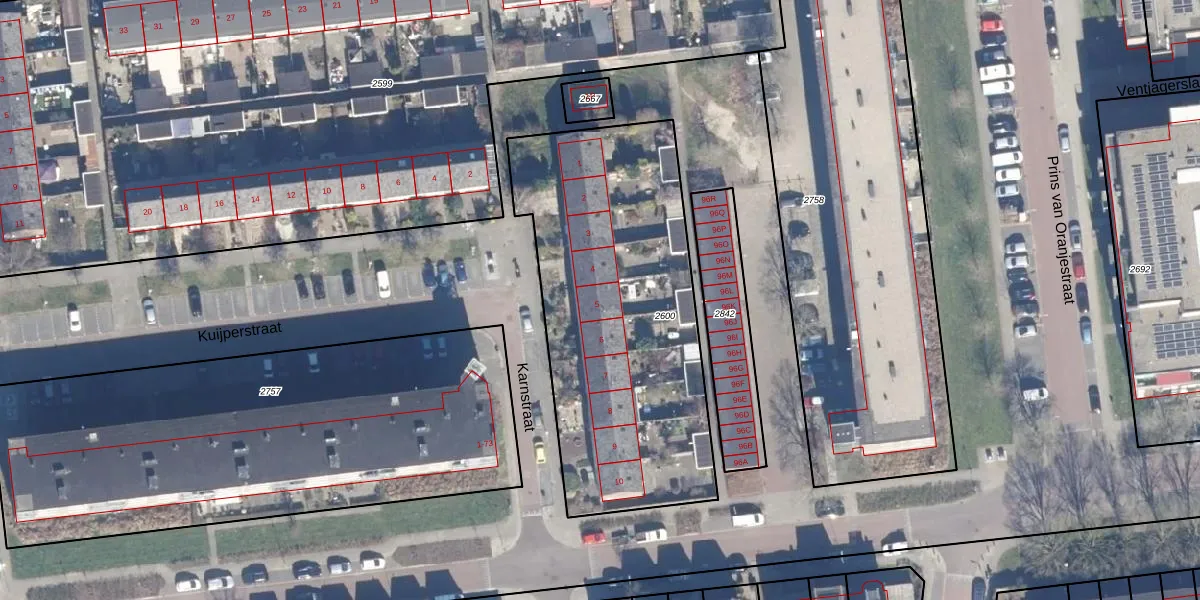 Het perceel waarop Karnstraat 5 staat heeft een oppervlakte van 1645 m². Dit is een zeer groot perceel. De perceeloppervlakte wordt geregistreerd door het Kadaster. Gedetailleerde informatie over de maten van dit perceel kunt u vinden in het rapport Kadastrale kaart met maatvoering van Karnstraat 5.
