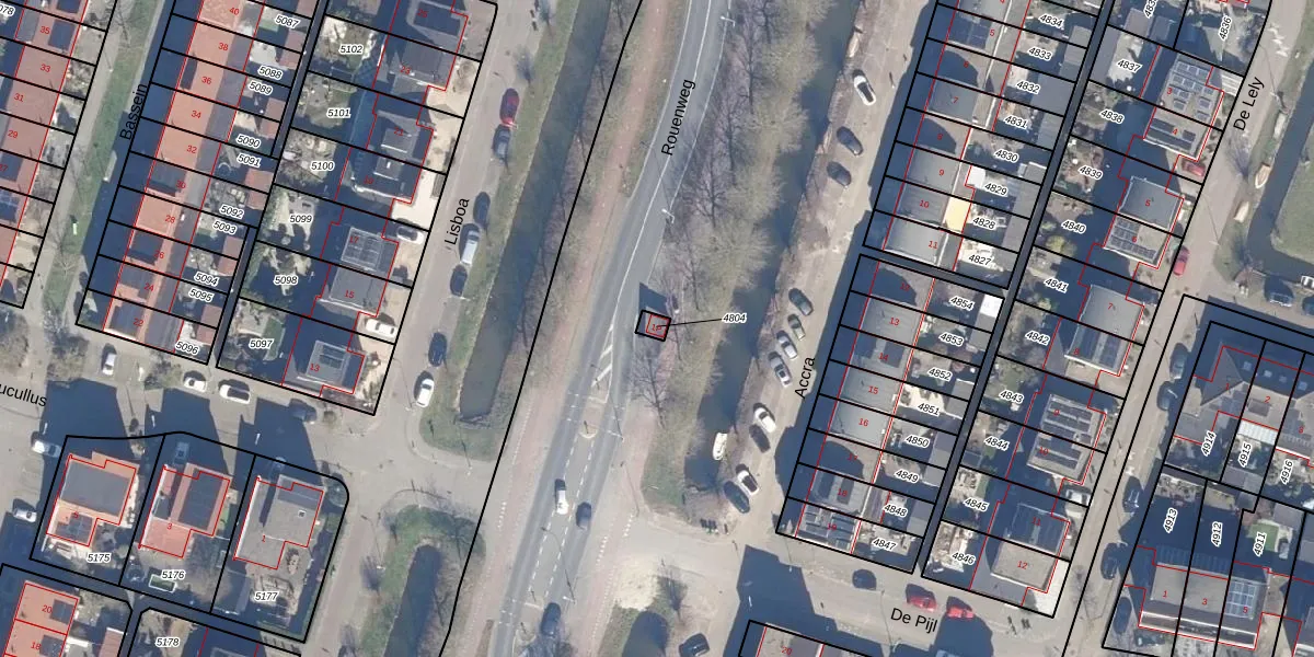 Het perceel waarop Rouenweg 1-P staat heeft een oppervlakte van 16 m². Dit is een klein perceel. De perceeloppervlakte wordt geregistreerd door het Kadaster. Gedetailleerde informatie over de maten van dit perceel kunt u vinden in het rapport Kadastrale kaart met maatvoering van Rouenweg 1-P.