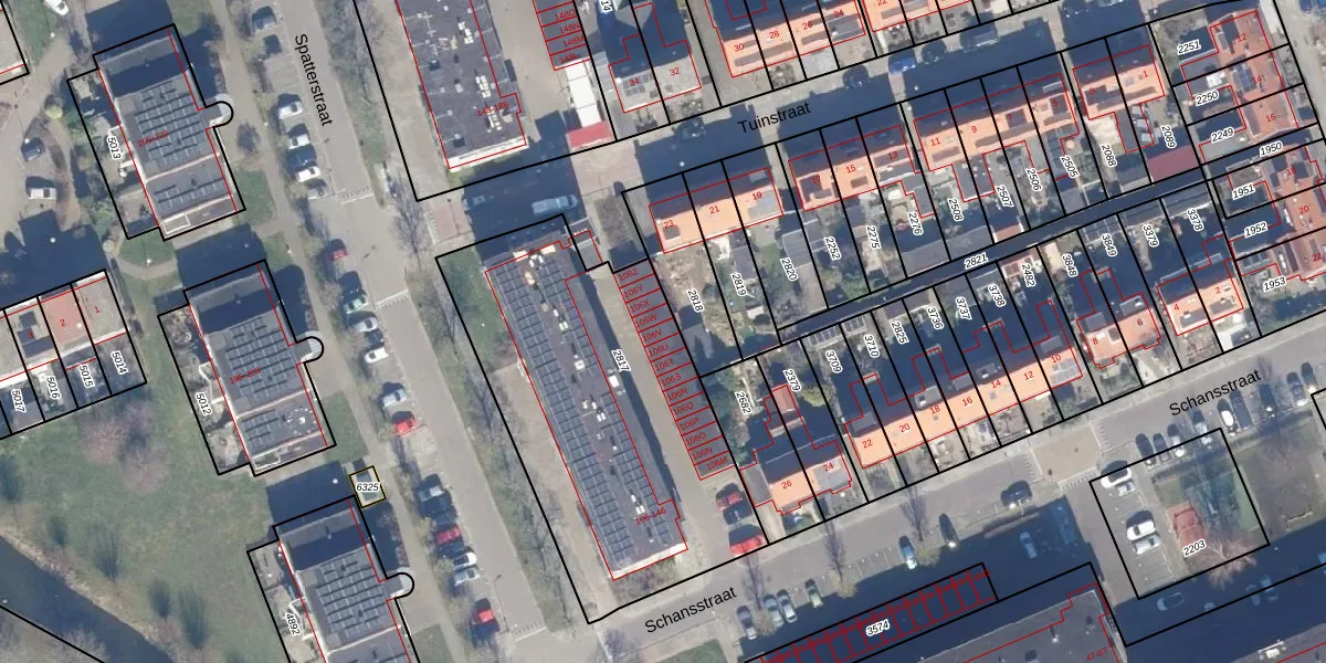 Het perceel waarop Spatterstraat 106-V staat heeft een oppervlakte van 1635 m². Dit is een zeer groot perceel. De perceeloppervlakte wordt geregistreerd door het Kadaster. Gedetailleerde informatie over de maten van dit perceel kunt u vinden in het rapport Kadastrale kaart met maatvoering van Spatterstraat 106-V.