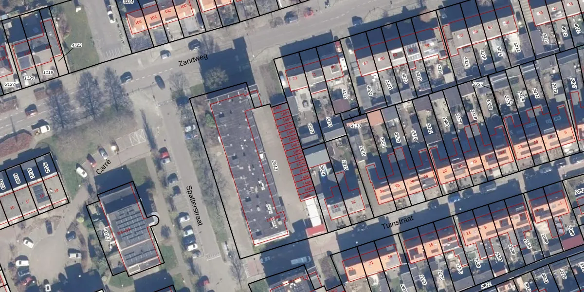 Het perceel waarop Spatterstraat 148-T staat heeft een oppervlakte van 1693 m². Dit is een zeer groot perceel. De perceeloppervlakte wordt geregistreerd door het Kadaster. Gedetailleerde informatie over de maten van dit perceel kunt u vinden in het rapport Kadastrale kaart met maatvoering van Spatterstraat 148-T.