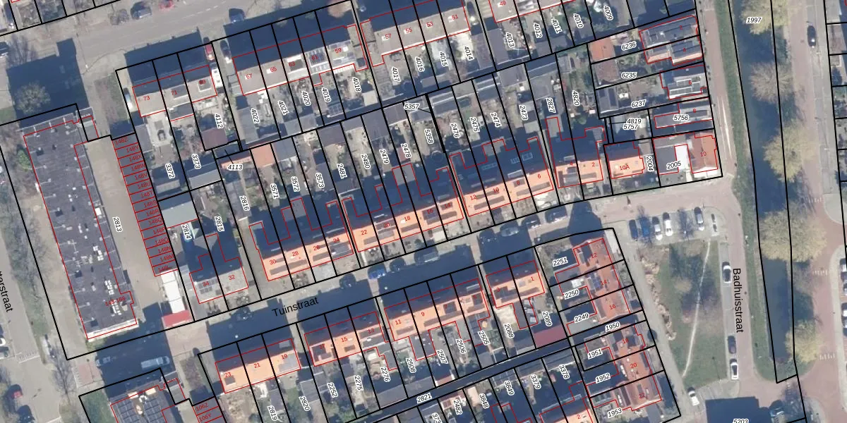 Het perceel waarop Tuinstraat 16 staat heeft een oppervlakte van 182 m². Dit is een middelgroot perceel. De perceeloppervlakte wordt geregistreerd door het Kadaster. Gedetailleerde informatie over de maten van dit perceel kunt u vinden in het rapport Kadastrale kaart met maatvoering van Tuinstraat 16.