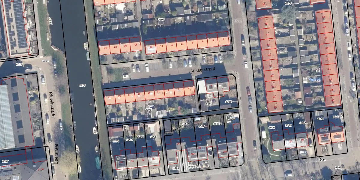 Het perceel waarop Visserstraat 7 staat heeft een oppervlakte van 1030 m². Dit is een zeer groot perceel. De perceeloppervlakte wordt geregistreerd door het Kadaster. Gedetailleerde informatie over de maten van dit perceel kunt u vinden in het rapport Kadastrale kaart met maatvoering van Visserstraat 7.
