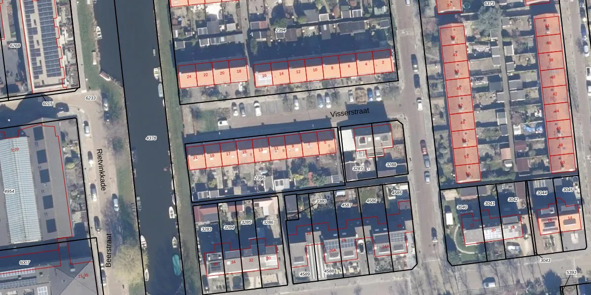 Het perceel waarop Visserstraat 9 staat heeft een oppervlakte van 1030 m². Dit is een zeer groot perceel. De perceeloppervlakte wordt geregistreerd door het Kadaster. Gedetailleerde informatie over de maten van dit perceel kunt u vinden in het rapport Kadastrale kaart met maatvoering van Visserstraat 9.