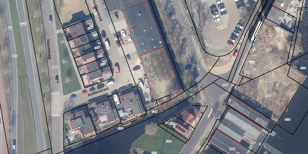 Het perceel waarop Antillenstraat 1-B staat heeft een oppervlakte van 3121 m². Dit is een zeer groot perceel. De perceeloppervlakte wordt geregistreerd door het Kadaster. Gedetailleerde informatie over de maten van dit perceel kunt u vinden in het rapport Kadastrale kaart met maatvoering van Antillenstraat 1-B.