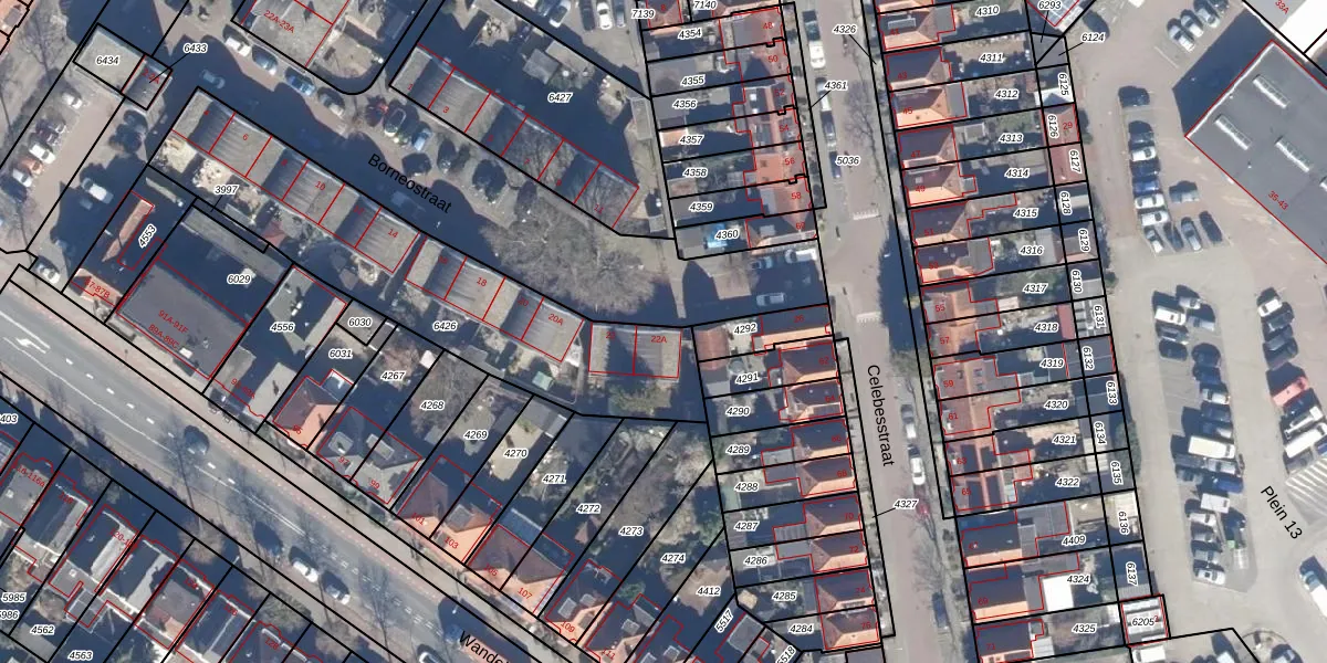 Het perceel waarop Borneostraat 22-A staat heeft een oppervlakte van 1299 m². Dit is een zeer groot perceel. De perceeloppervlakte wordt geregistreerd door het Kadaster. Gedetailleerde informatie over de maten van dit perceel kunt u vinden in het rapport Kadastrale kaart met maatvoering van Borneostraat 22-A.