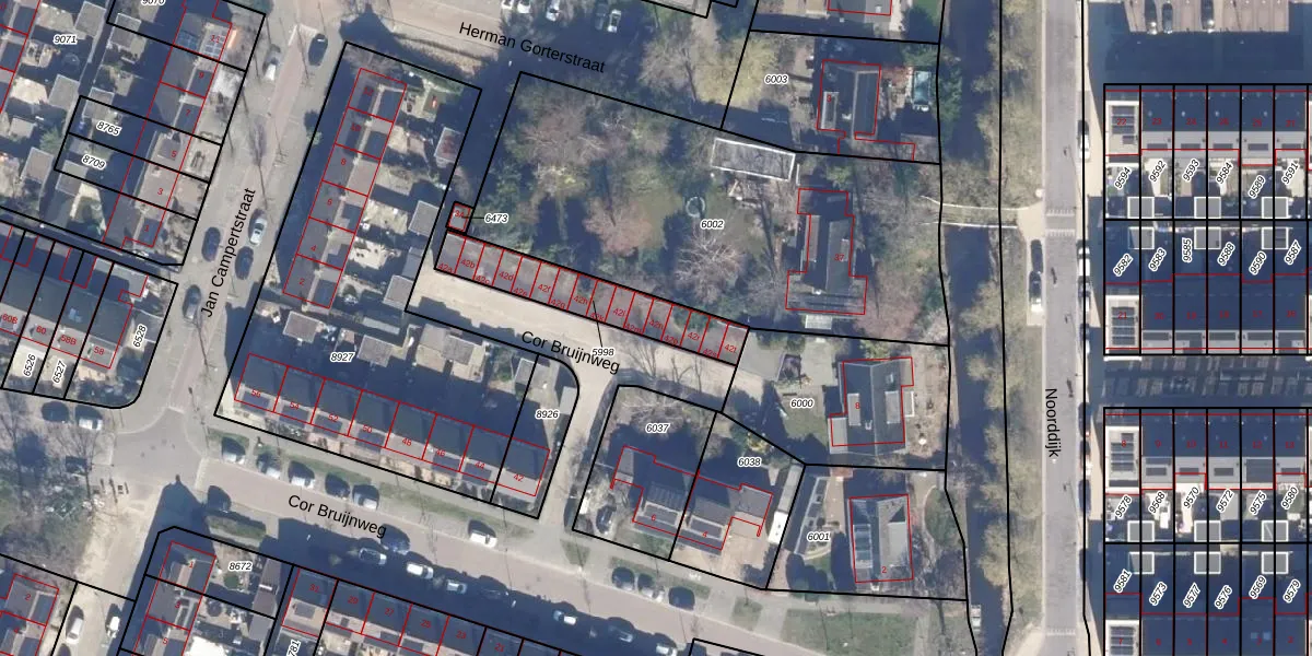 Cor Bruijnweg 42-n is gelegen op kadastraal perceel WMV00A5998. Deze kadastrale aanduiding is uniek en wordt gebruikt door het Kadaster om eigendomsrechten en andere zakelijke rechten vast te leggen. Het perceel maakt onderdeel uit van de kadastrale gemeente Wormerveer.