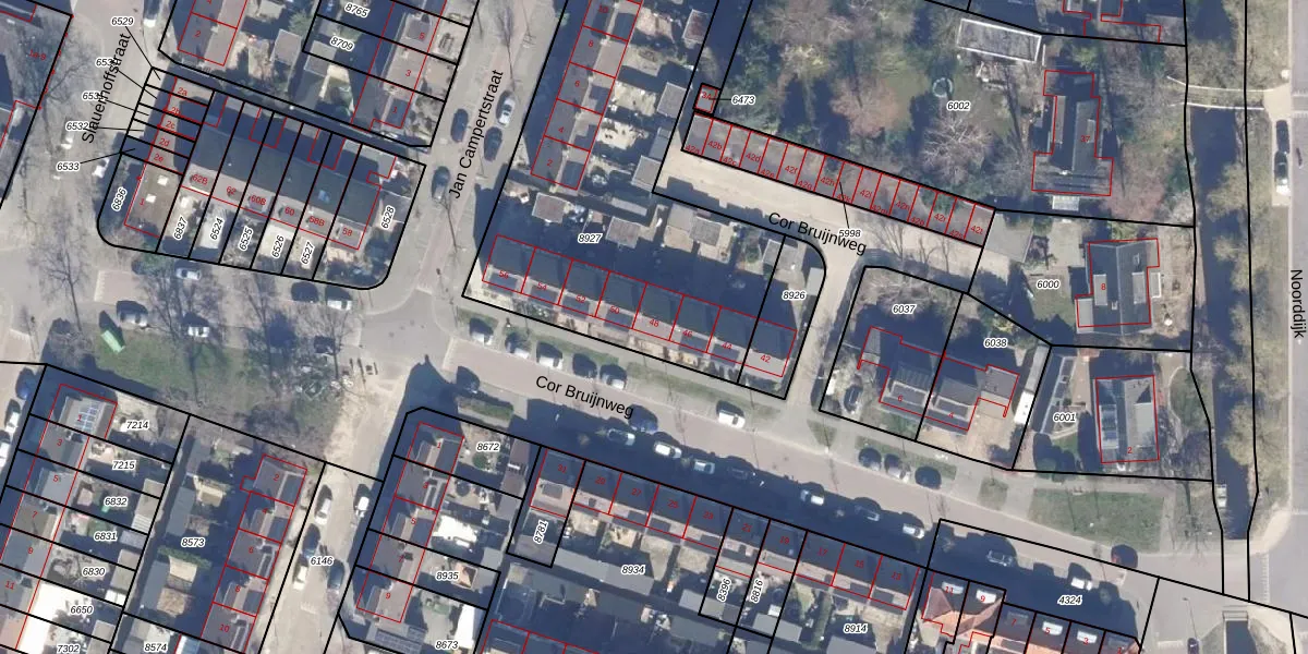 Het perceel waarop Cor Bruijnweg 48 staat heeft een oppervlakte van 1827 m². Dit is een zeer groot perceel. De perceeloppervlakte wordt geregistreerd door het Kadaster. Gedetailleerde informatie over de maten van dit perceel kunt u vinden in het rapport Kadastrale kaart met maatvoering van Cor Bruijnweg 48.