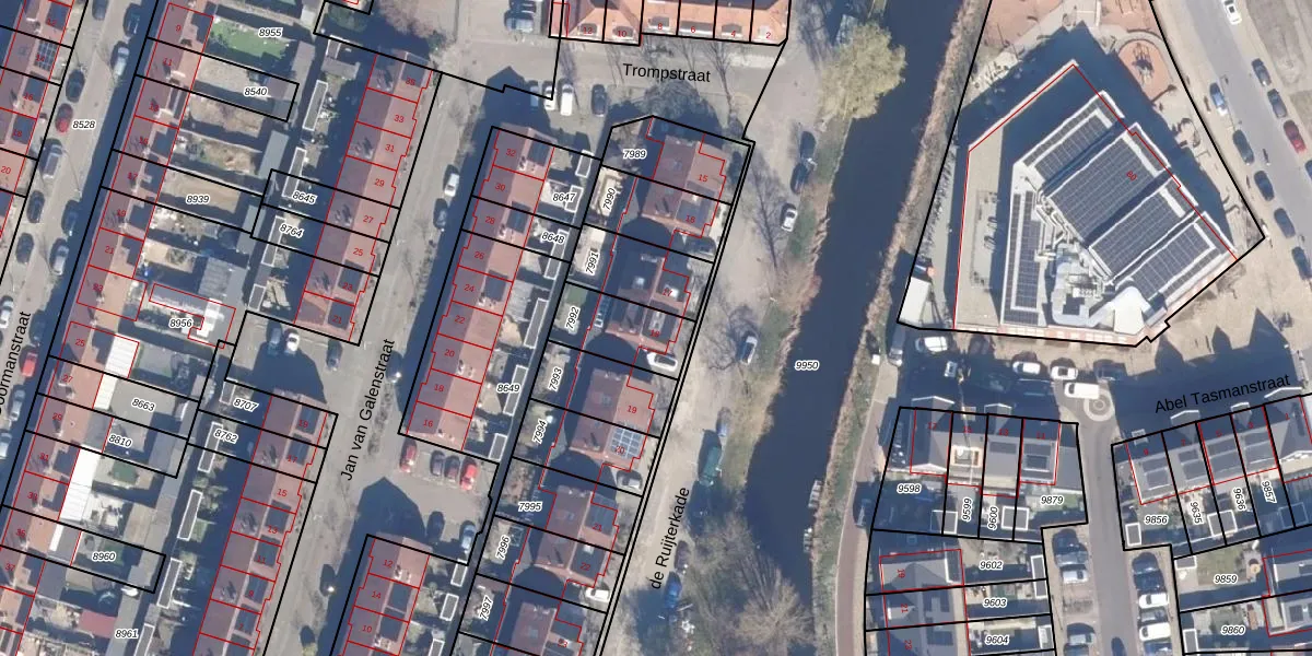 Het perceel waarop de Ruijterkade 18 staat heeft een oppervlakte van 195 m². Dit is een middelgroot perceel. De perceeloppervlakte wordt geregistreerd door het Kadaster. Gedetailleerde informatie over de maten van dit perceel kunt u vinden in het rapport Kadastrale kaart met maatvoering van de Ruijterkade 18.