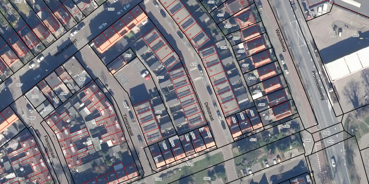 Het perceel waarop Delistraat 48 staat heeft een oppervlakte van 1570 m². Dit is een zeer groot perceel. De perceeloppervlakte wordt geregistreerd door het Kadaster. Gedetailleerde informatie over de maten van dit perceel kunt u vinden in het rapport Kadastrale kaart met maatvoering van Delistraat 48.