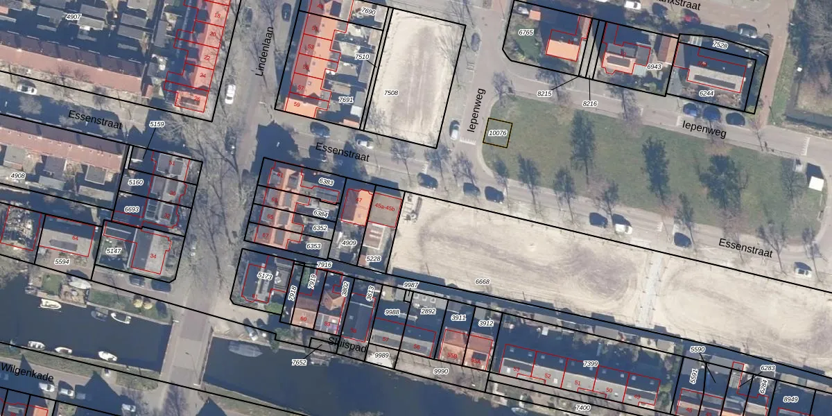 Het perceel waarop Essenstraat 43-E staat heeft een oppervlakte van 2160 m². Dit is een zeer groot perceel. De perceeloppervlakte wordt geregistreerd door het Kadaster. Gedetailleerde informatie over de maten van dit perceel kunt u vinden in het rapport Kadastrale kaart met maatvoering van Essenstraat 43-E.
