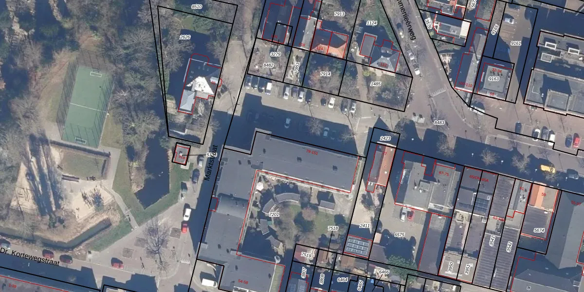 Het perceel waarop Marktstraat 85 staat heeft een oppervlakte van 2168 m². Dit is een zeer groot perceel. De perceeloppervlakte wordt geregistreerd door het Kadaster. Gedetailleerde informatie over de maten van dit perceel kunt u vinden in het rapport Kadastrale kaart met maatvoering van Marktstraat 85.