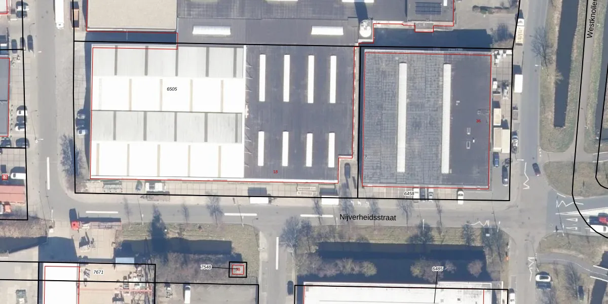 Het perceel waarop Nijverheidsstraat 18 staat heeft een oppervlakte van 4705 m². Dit is een zeer groot perceel. De perceeloppervlakte wordt geregistreerd door het Kadaster. Gedetailleerde informatie over de maten van dit perceel kunt u vinden in het rapport Kadastrale kaart met maatvoering van Nijverheidsstraat 18.