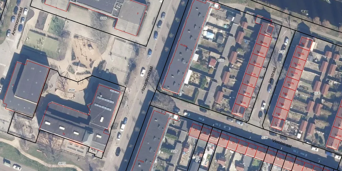 Het perceel waarop Noorderstraat 44 staat heeft een oppervlakte van 3436 m². Dit is een zeer groot perceel. De perceeloppervlakte wordt geregistreerd door het Kadaster. Gedetailleerde informatie over de maten van dit perceel kunt u vinden in het rapport Kadastrale kaart met maatvoering van Noorderstraat 44.