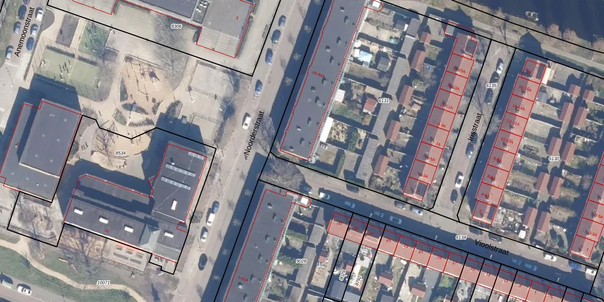 Het perceel waarop Noorderstraat 46 staat heeft een oppervlakte van 3436 m². Dit is een zeer groot perceel. De perceeloppervlakte wordt geregistreerd door het Kadaster. Gedetailleerde informatie over de maten van dit perceel kunt u vinden in het rapport Kadastrale kaart met maatvoering van Noorderstraat 46.