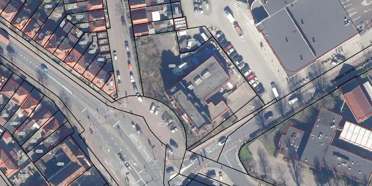 Het perceel waarop Plein 13 1-K staat heeft een oppervlakte van 2246 m². Dit is een zeer groot perceel. De perceeloppervlakte wordt geregistreerd door het Kadaster. Gedetailleerde informatie over de maten van dit perceel kunt u vinden in het rapport Kadastrale kaart met maatvoering van Plein 13 1-K.