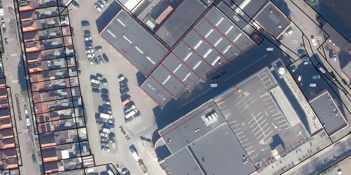 Het perceel waarop Plein 13 49 staat heeft een oppervlakte van 1,3 ha. Dit is een zeer groot perceel. De perceeloppervlakte wordt geregistreerd door het Kadaster. Gedetailleerde informatie over de maten van dit perceel kunt u vinden in het rapport Kadastrale kaart met maatvoering van Plein 13 49.