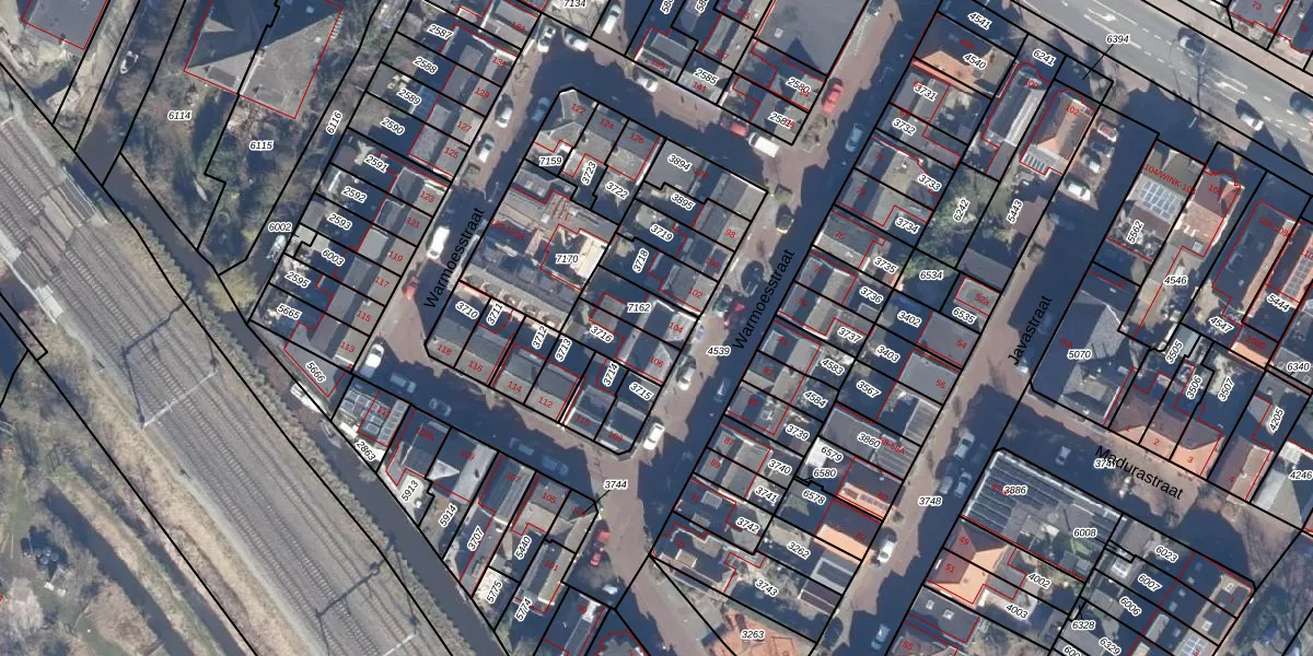 Warmoesstraat 104 is gelegen op kadastraal perceel WMV00B7162. Deze kadastrale aanduiding is uniek en wordt gebruikt door het Kadaster om eigendomsrechten en andere zakelijke rechten vast te leggen. Het perceel maakt onderdeel uit van de kadastrale gemeente Wormerveer.