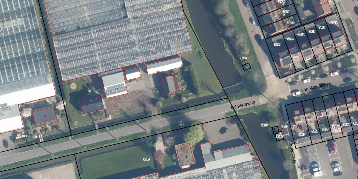 Tuindersweg 1 is gelegen op kadastraal perceel WBG00B3142. Deze kadastrale aanduiding is uniek en wordt gebruikt door het Kadaster om eigendomsrechten en andere zakelijke rechten vast te leggen. Het perceel maakt onderdeel uit van de kadastrale gemeente Woubrugge.