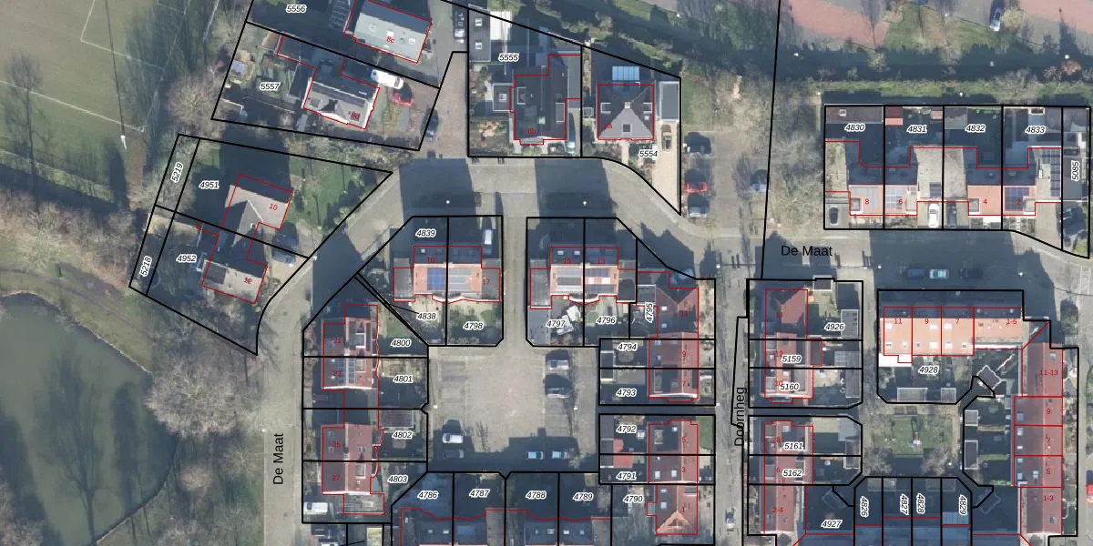 Het perceel waarop De Maat 15 staat heeft een oppervlakte van 240 m². Dit is een middelgroot perceel. De perceeloppervlakte wordt geregistreerd door het Kadaster. Gedetailleerde informatie over de maten van dit perceel kunt u vinden in het rapport Kadastrale kaart met maatvoering van De Maat 15.